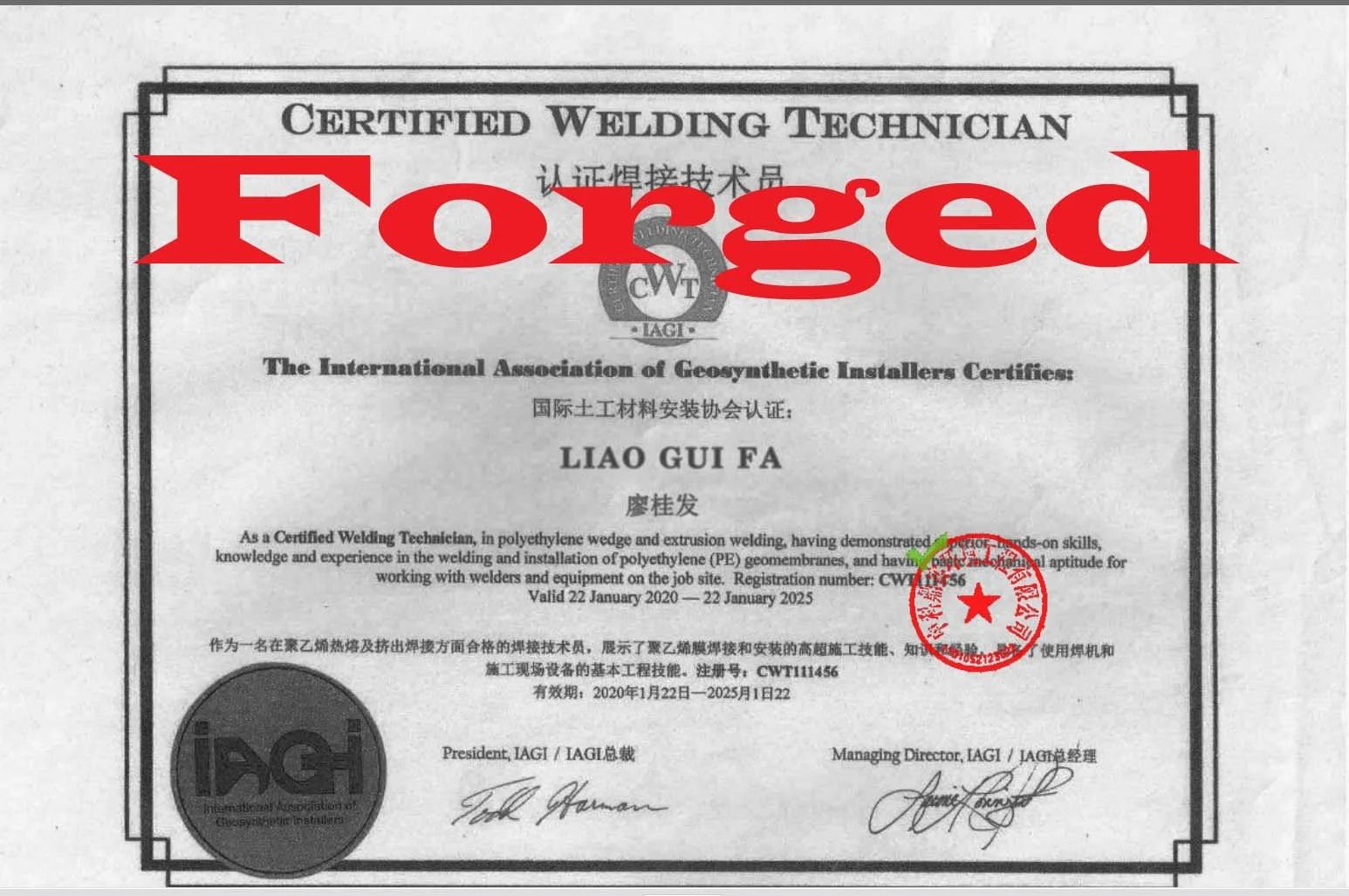 Unfortunately, some people and companies would rather cheat than take the Certified Welding Exam and prove that the technicians can pass the CWT exam. The following is the hall of shame of those people who have provided false certificates to the engineering community. If you want to check the validity of the certificates that were submitted on your job site, submit copies of the certificates to iagi@iagi.org and you will get confirmation of their validity or non-validity.